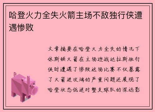 文章摘要:在哈登火力全失的情况下,休斯顿火箭在主场迎战达拉斯独行侠时遭遇了惨败。这场比赛不仅暴露了火箭进攻端的严重问题,还展现了哈登状态低迷对整支球队的深远影响。尽管火箭队在阵容上有着较大的潜力,但面对独行侠的压制,他们始终未能找回节奏,最...